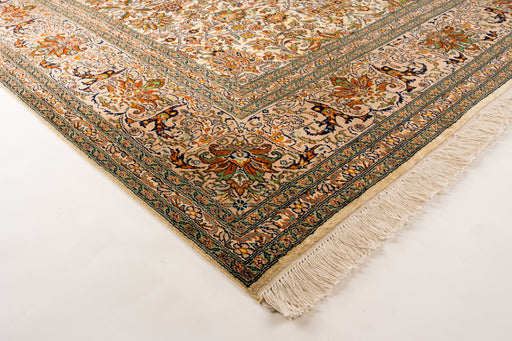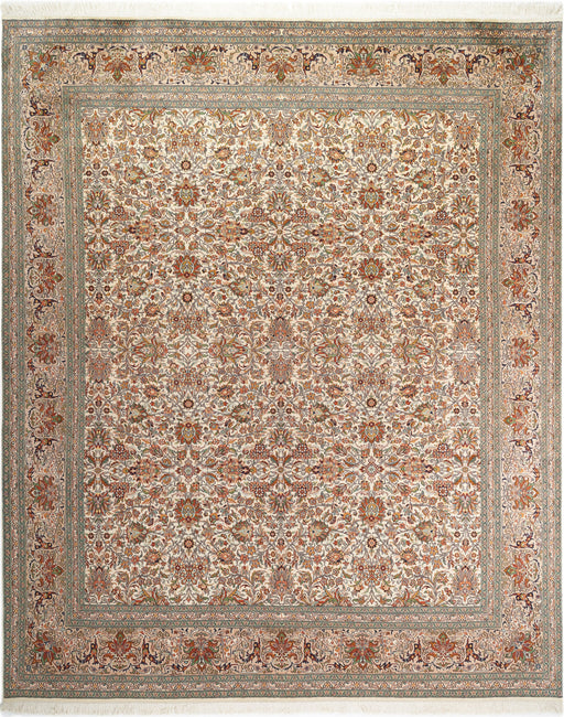 Colour: Ivory and Light Brown. Material: Pure fine silk on a cotton base Dimensions: 8'01" x 9'08" Construction: Hand Knotted. Made in Kashmir, In...