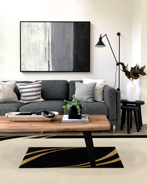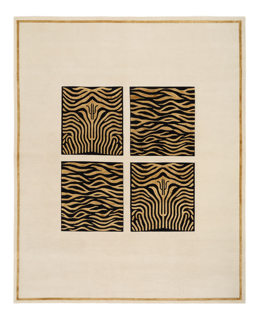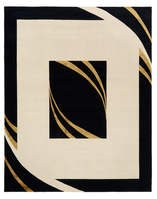 Benares Contemporary Design. Gold Silk Accent and a Black wool Border with a field colour in Beige made up New Zealand wool yarns. Indo-Nepalese...