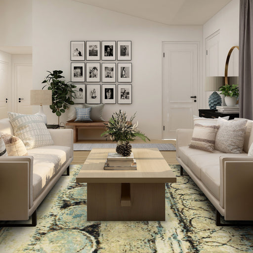 This contemporary rug blends earthy neutrals with soft blue tones, creating a piece that feels both grounded and artistic The design features textu...