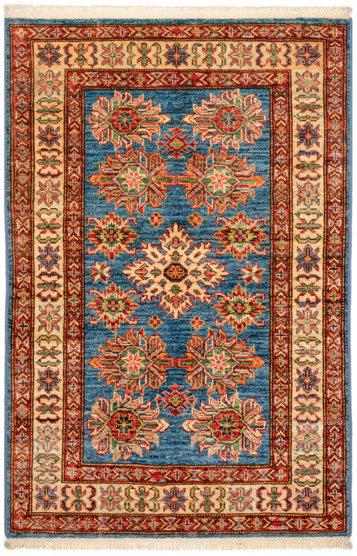 Note: These are one-of-a-kind pieces in limited production. Custom not possible. Design: Super Kazak Colour: Light Blue, Ivory and Red. Size: ...