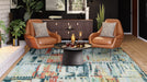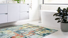 This new contemporary design showcases an abstract design in soft blues, greys, and creams, accented with touches of red, gold, and green.